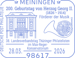 Deutsche Post Philatelie / 200. Geburtstag Herzog Georg II. / 1826 - 1914 / Förderer der Musik / 38. Landesverbandstag Thüringer Philatelisten / im Max-Reger- / Konservatorium